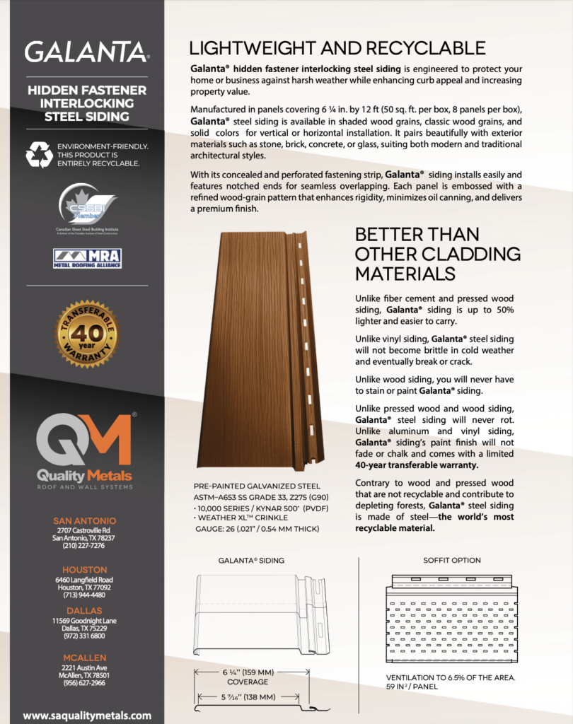 Galanta® Steel Siding delivers a modern, seamless appearance with the strength and reliability of interlocking steel. Designed with a hidden fastener system, it provides durability, weather resistance, and ease of installation without exposed screws or clips. Lightweight, recyclable, and built to perform better than traditional cladding materials, Galanta® is ideal for residential, commercial, and architectural projects where long-term performance and aesthetics matter.