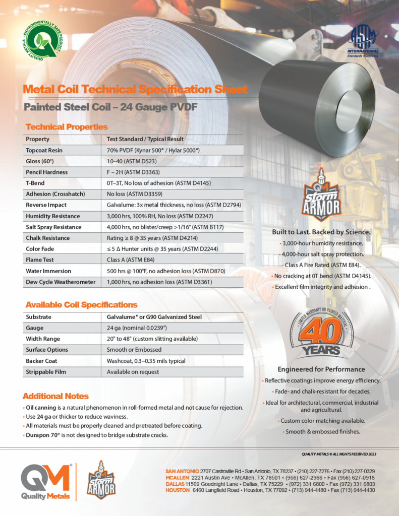 The PVDF Storm Armor Paint System by Quality Metals delivers premium performance and unmatched durability for architectural and commercial metal applications. Developed with advanced 70% PVDF fluoropolymer technology, this coating system provides superior protection against fading, chalking, and corrosion — even in the most extreme weather environments.