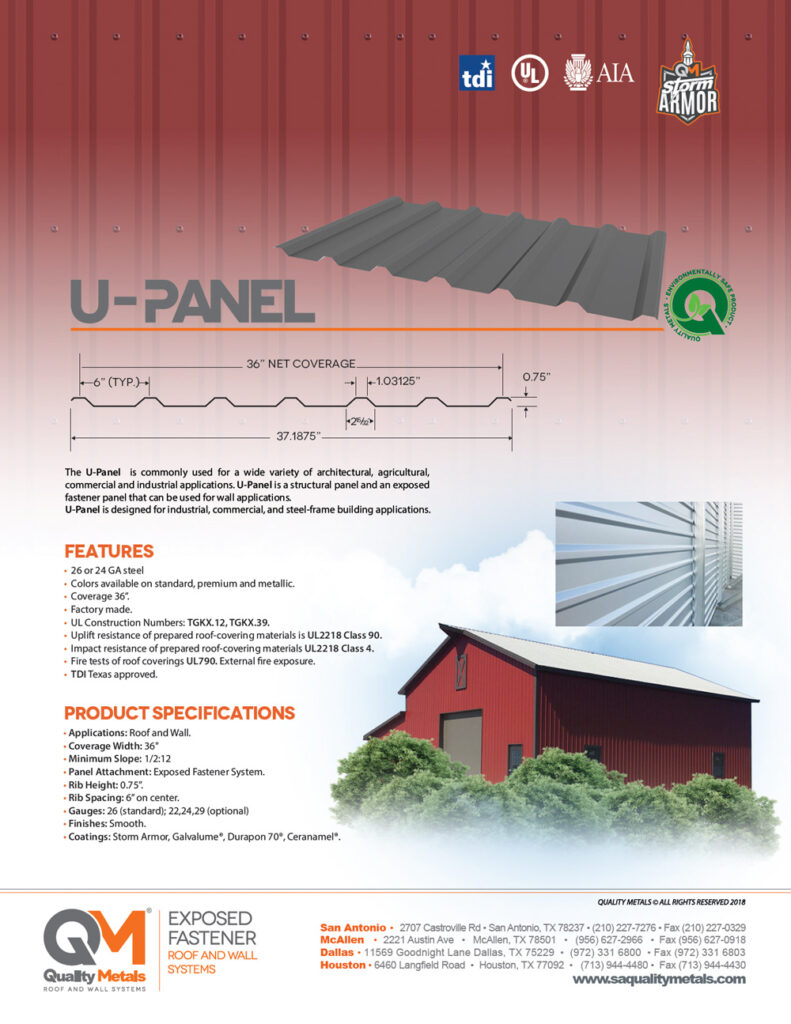 The U-Panel is commonly used for a wide variety of architectural, agricultural, commercial and industrial applications. U-Panel is a structural panel and an exposed fastener panel that can be used for wall applications.